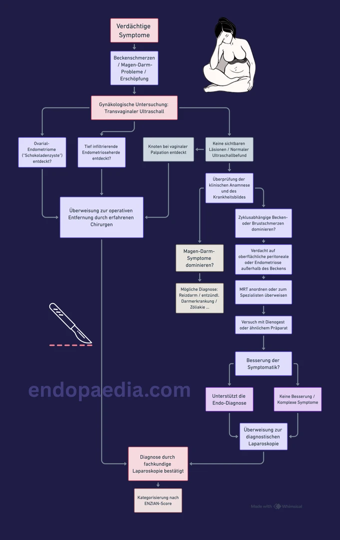 Wie du am obigen Flowchart erkennen kannst, gehört Endo in Expertenhände und kann v.a. nur dort eine schnelle Diagnose ermöglichen und unnötiges weiteres Leid verhindern. Mehr zu Endo-Kategorien und zum ENZIAN-Score findest du auf der Was ist Endo?-Seite.